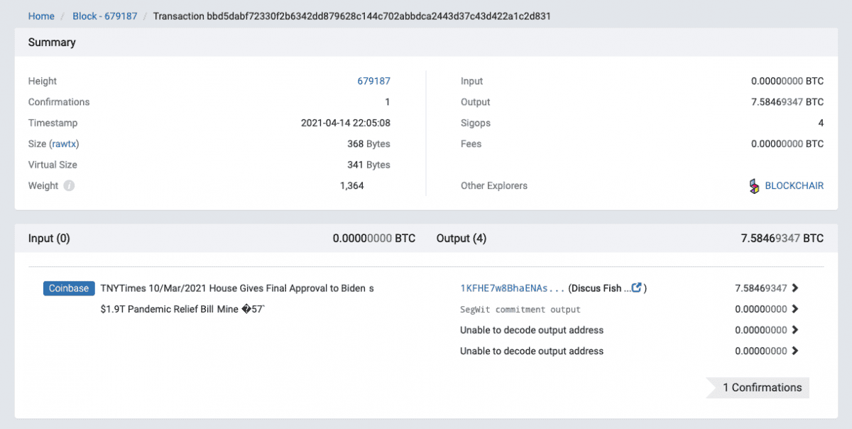 F2Pool encodes Biden stimulus headline to mark Coinbase's direct listing on Nasdaq April 14, 2021, 10:31AM EDT Bitcoin