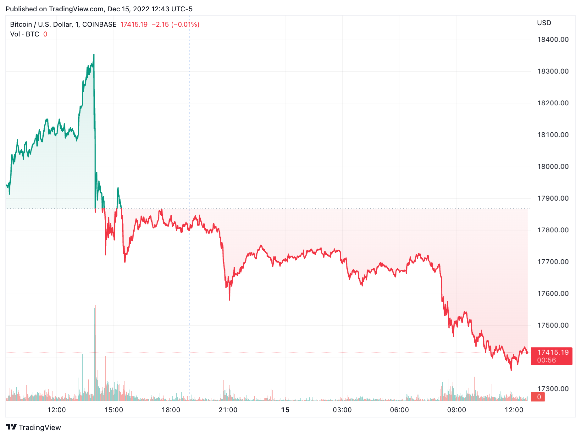 Bitcoin slipped 4% to trade around $17,400 at 12:30 p.m. EST today, according to TradingView data. Ether is down 5% over the past 24 hours, trading at $1,271 – the majority of losses also followed the Fed news. Binance's BNB token has continued to trend lower today, dipping 3.5%. Dog-themed memecoins had a rough ride too, with dogecoin and shiba inu shedding 5.2% and 3.5%, respectively.