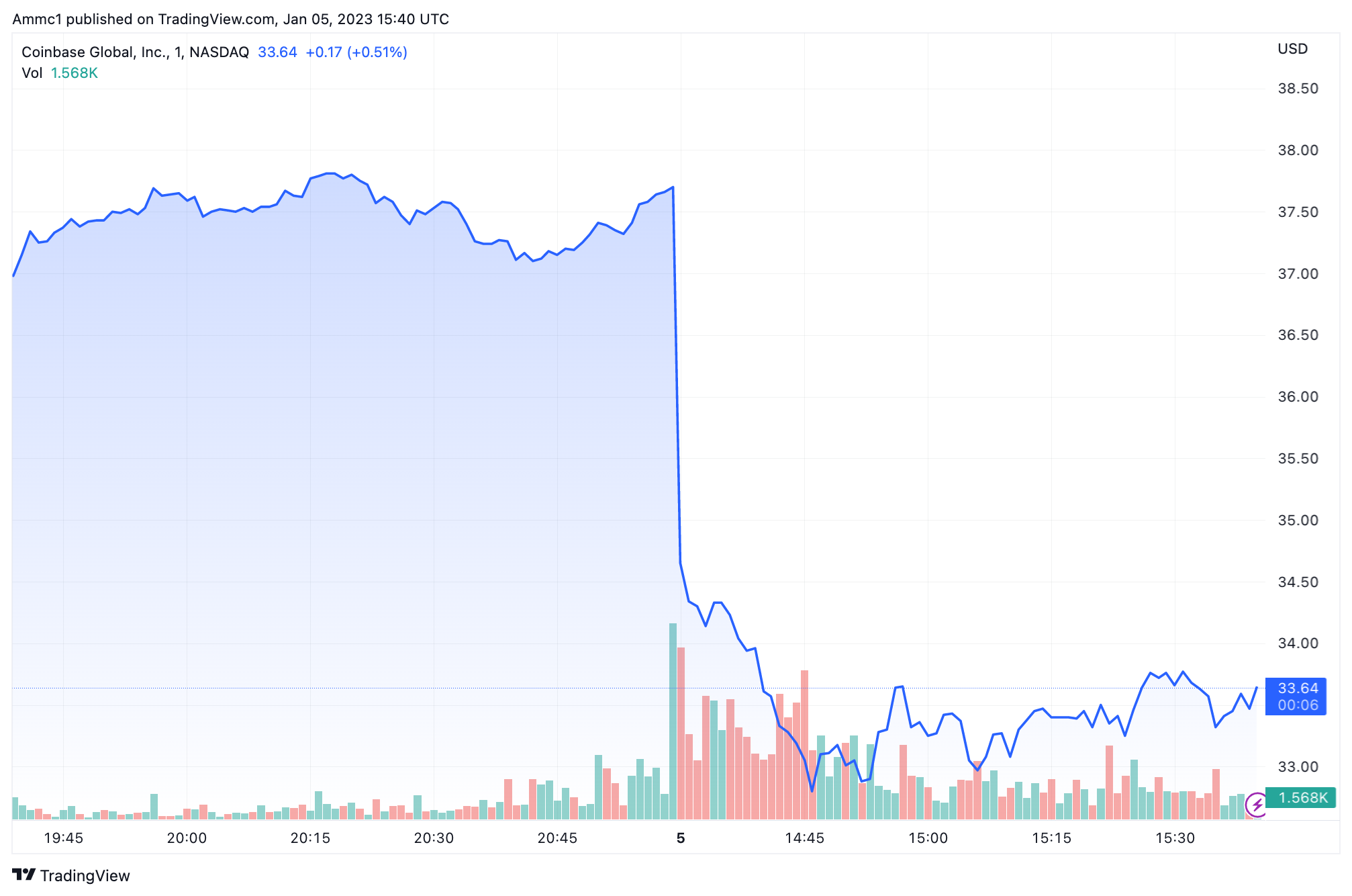 - Cowen analysts downgraded Coinbase to market perform, reducing 2023 revenue expectations and cutting its price target to $36.