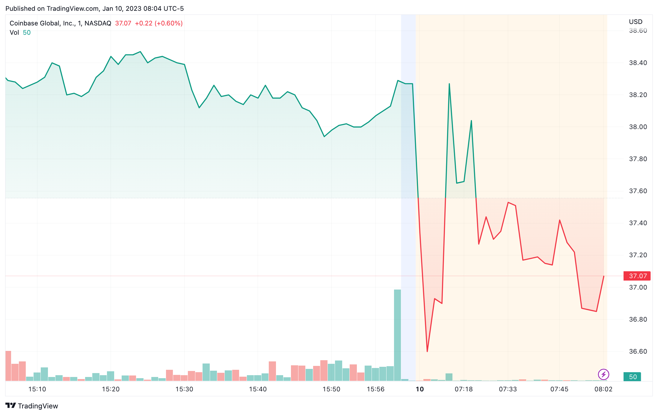 Shares in the crypto exchange fell 3.1% in the early session, trading around $37 by 8 a.m., according to data via Nasdaq. COIN closed above $38 yesterday, up 15%.