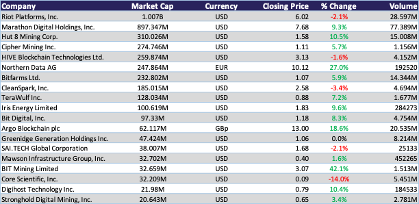 Bitcoin mining stocks tracked by The Block were mostly higher on Friday, with 13 gaining and the other 5 declining.