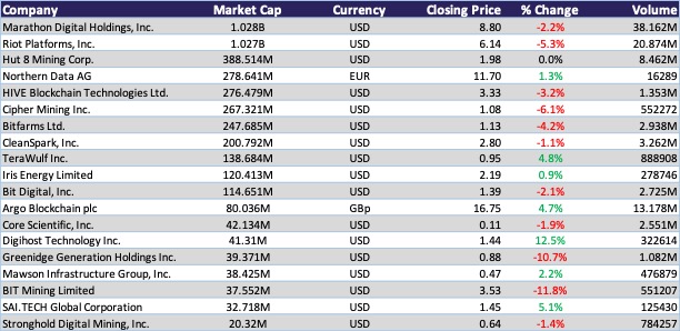 Bitcoin mining stocks tracked by The Block were mostly lower on Tuesday, with seven gaining and the other 11 declining.