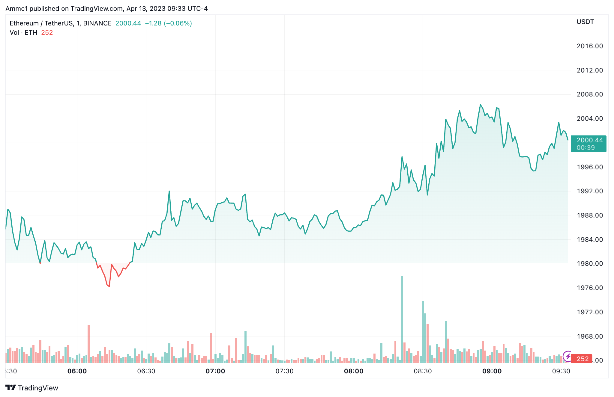 Ether was trading hands for $2,000 by 9:30 a.m. EDT — up 1.1% over the past five hours, according to Binance data via TradingView. The move follows Ethereum's first significant upgrade since The Merge, Shapella, which was completed around 6:30 p.m. EST last night.
