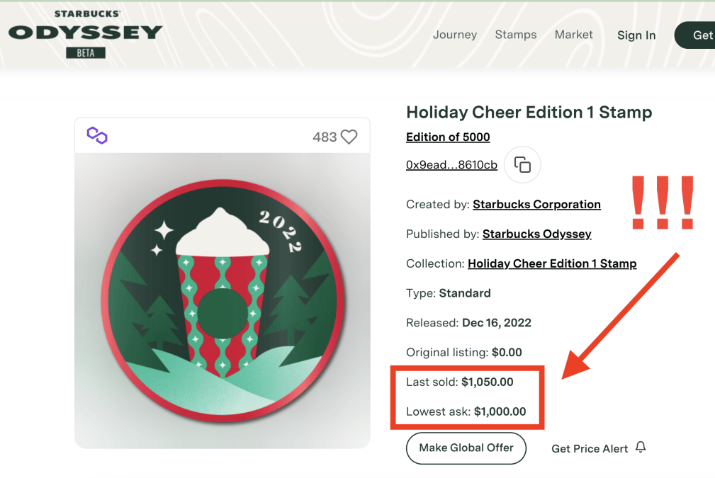 But now, Starbucks is offering you a much faster way to get rich: if you were lucky enough to obtain a “Holiday Cheer Edition 1 Stamp” last year — there were only 5,000 of them! — you could expect to sell it on for $1,000, according to Starbucks’ Odyssey NFT marketplace. There have been 210 sales in the secondary market since the collection launched four months ago, with the most recent deal closing at $901 today.