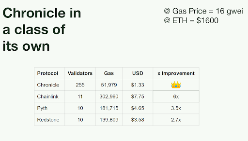 In short, what does this all mean? As on-chain usage continues to rise and gas prices with it, Chronicle ensures that Oracle users have a truly cost-efficient option that scales with their business whilst increasing the security of the Oracle protocol instead of lowering it.