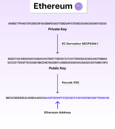 Similarly, an Ethereum address is derived by taking a private key, doing an elliptic curve derivation using the Secp256k1 standard to get a public key, hashing that public key using the Keccak-256 hash function, and then taking the last 20 bytes of the hash output to get the address.