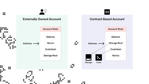 Externally Owned Accounts (user accounts) vs. Smart Contract Accounts (used for smart contract wallets in Ethereum)