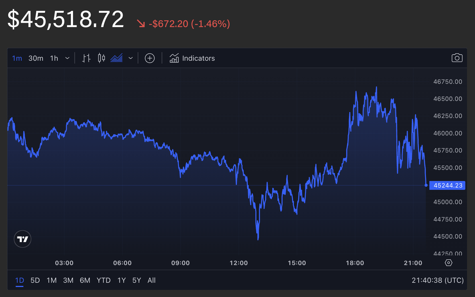 - The price action was far more dramatic yesterday; bitcoin’s price jumped to $48,000 before dropping to $45,000 following a fake announcement from the SEC yesterday.