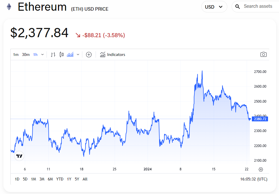 The price of ether has fallen by over 3% in the past 24 hours to trade at $2,377, according to The Block's Prices Page.