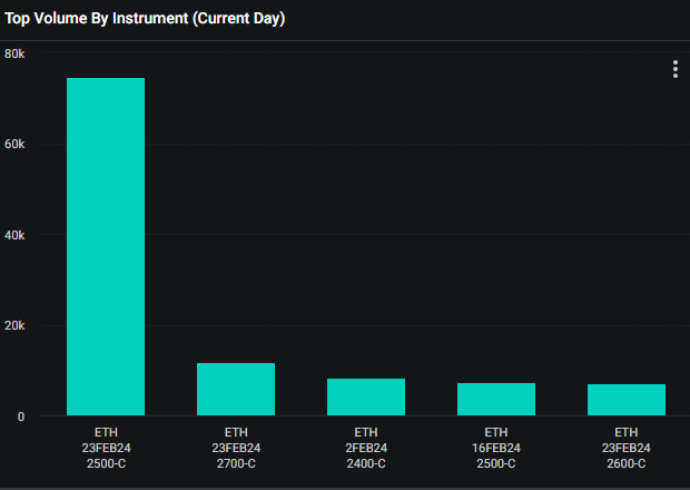 Data from Deribit show that the majority of ether options contracts outstanding are for calls at a strike price of $2,500, set to expire on Friday, Feb. 23. According to Deribit data, there are over 74,548 contracts outstanding for calls at the strike price of $2,500, with a notional value of around $172 million.