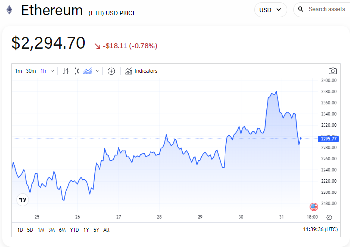 The presence of a significant number of call options at $2,500 indicates that a substantial portion of traders are anticipating an increase in the price of ether above $2,500 by the expiration date on the last Friday of February. However, the price of ether has fallen by almost 1% in the past 24 hours to trade at $2,294, according to The Block's Price Page.