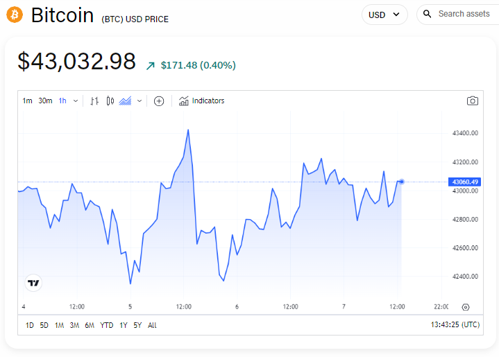 - Bitcoin traded flat over the last 24 hours, holding above the $43,000 mark.