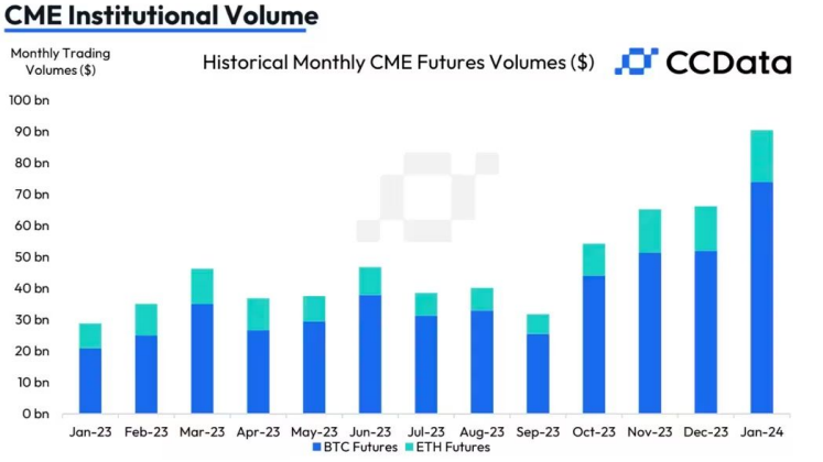 According to Bitfinex analysts, trading volume for both bitcoin and ether futures on CME experienced a significant increase in activity in January, which coincided with the approval of multiple spot bitcoin ETFs by the US Securities and Exchange Commission (SEC). "Trading volumes on the CME surged by 35% in January, reaching a high of $94.9 billion, the most substantial volume since October 2021. This indicates heightened institutional interest in cryptocurrency exposure," Bitfinex analysts said in an email sent to The Block.