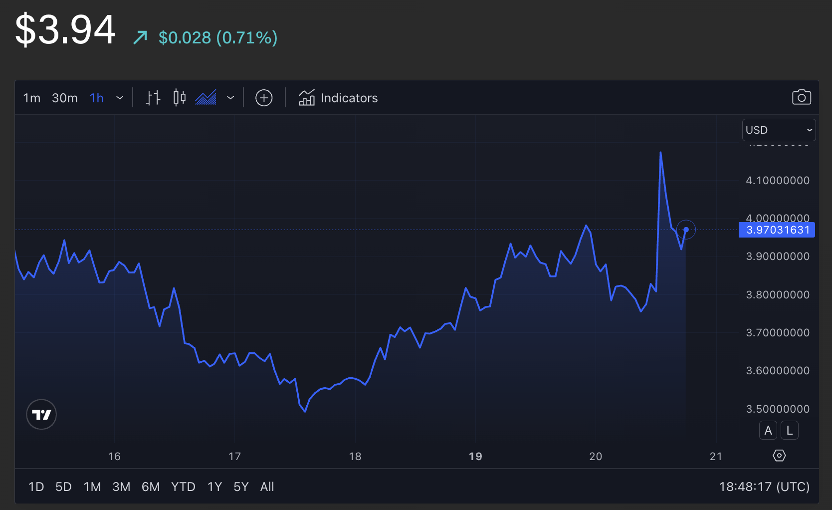 The OP token trades at $3.94 at 1:47 p.m. ET on Feb. 20, after seeing a 0.71% increase in the past 24 hours, according to The Block's Price page for the token. OP has a circulating supply of 957.4 million and total supply of 4.3 billion.