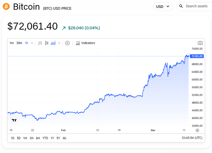 The bitcoin price has rallied to a record high to hold above the $72,000 mark. Over the past month the price of the digital currency has surged more than 40%.
