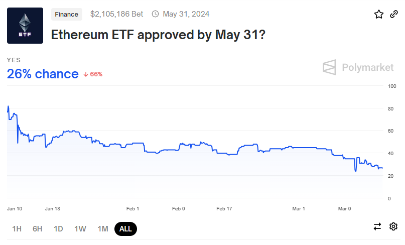 Ether spot ETF end of May approval odds plummet to 28% on Polymarket