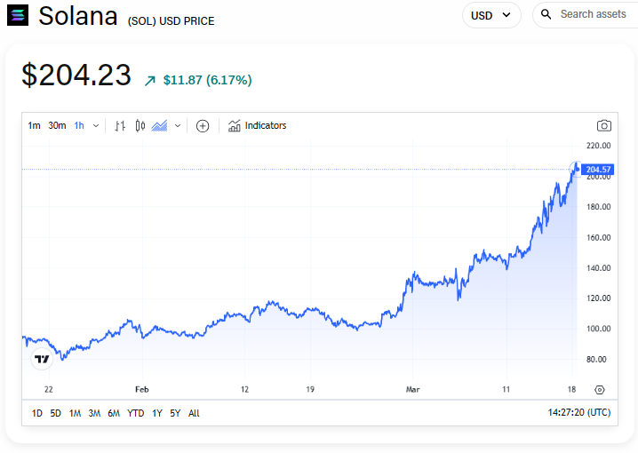 Solana's market capitalization reached a new all-time high on March 15. SOL increased by 6.17% in the past 24 hours, changing hands for $204.23 at 10:37 a.m. ET., per The Block's price data.