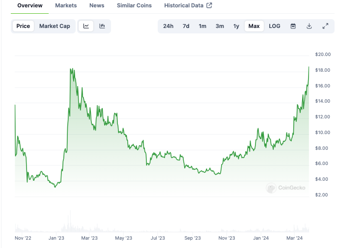 The APT token was changing hands at $18.78 as of 10:51 a.m. EST, according to CoinGecko, with Tuesday's price the highest APT has traded since hitting its previous high in January 2023.