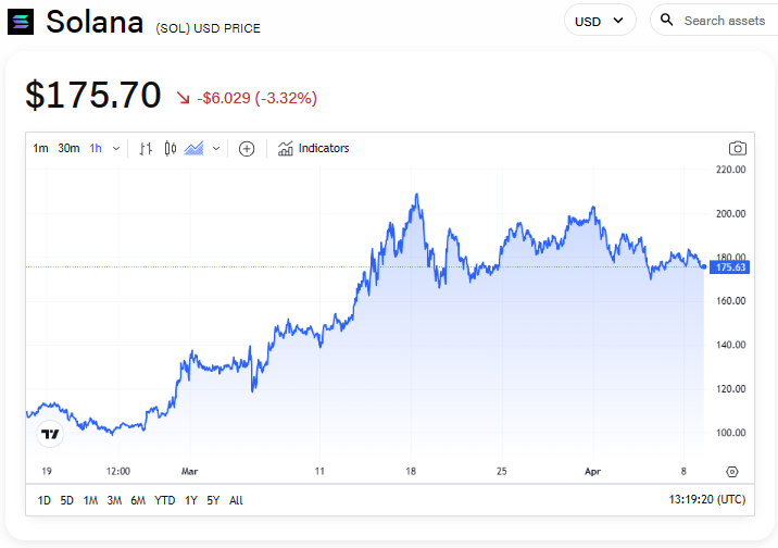 Sol decreased by over 3% in the past 24 hours and was changing hands for $175 at 9:22 a.m. ET, according to The Block's Price Page.