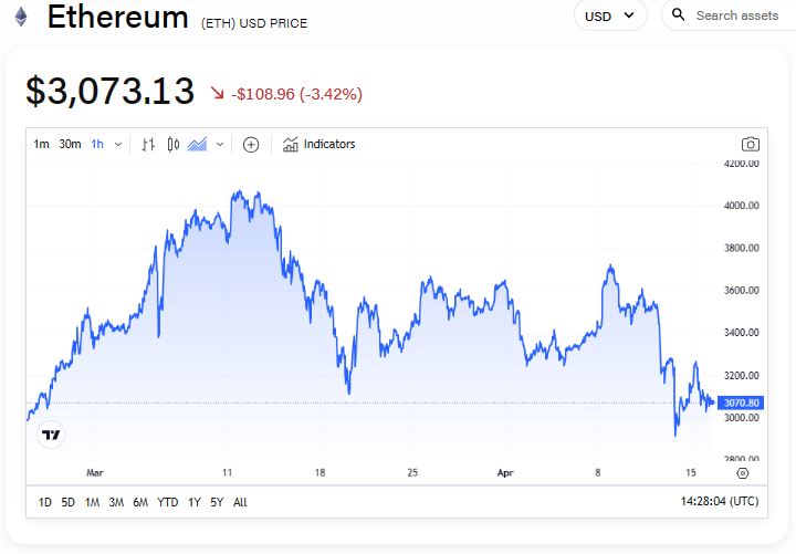Ether decreased by around 3.4% in the past 24 hours and was changing hands for $3,073 at 10:31 a.m. ET, according to The Block's Price Page.