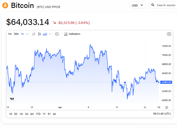 The price of bitcoin held just slightly above the $64,000 mark, falling by over 3.6% in the past 24 hours. Image: The Block.