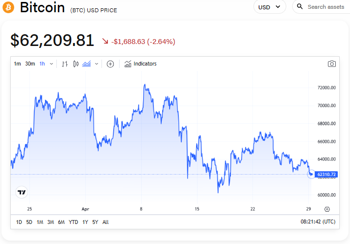 The bitcoin price slipped by over 2.6% in the past 24 hours and was changing hands for $62,209 at 4:51 a.m. ET., according to The Block's Price Pages.