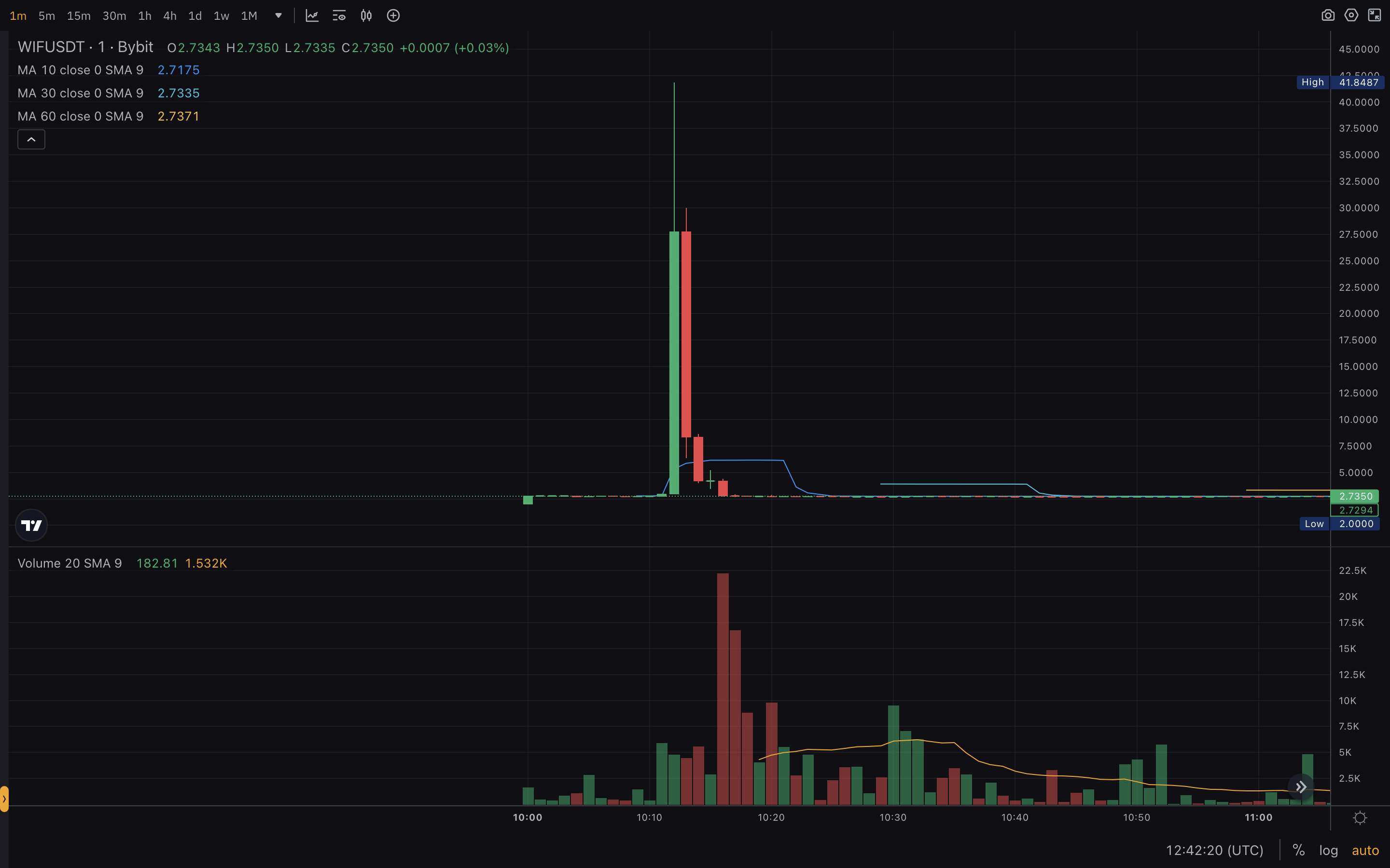 The price of WIF spiked significantly on Bybit shortly after listing. Image: Bybit.