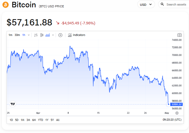 Bitcoin is holding precariously above the $57,000 mark, having fallen by almost 8% in the past 24 hours, and was trading at $57,161 at 5:22 a.m. ET, according to The Block’s Price Page. The price of ether has dropped by 6.2% to $2,870 in the same period.