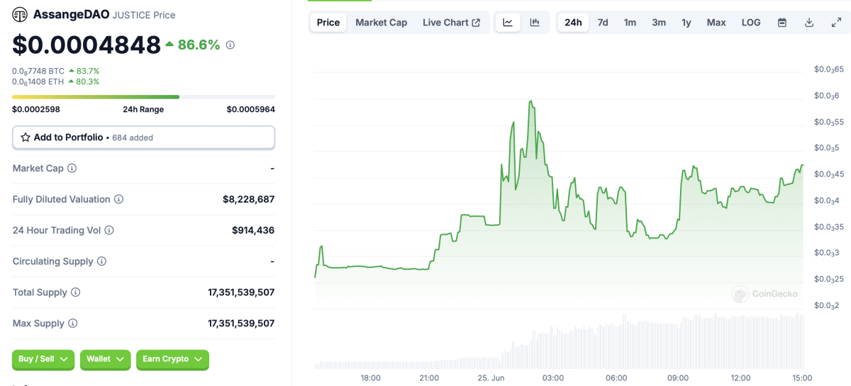 AssangeDAO's token (ticker: JUSTICE) has gained over 80% since Julian Assange was released from the UK's high-security Belmarsh prison on Monday after spending 1,901 days there.