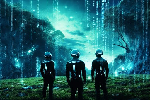 Alt text: Futuristic image of 3 Atornauts looking at a blend of nature and technology