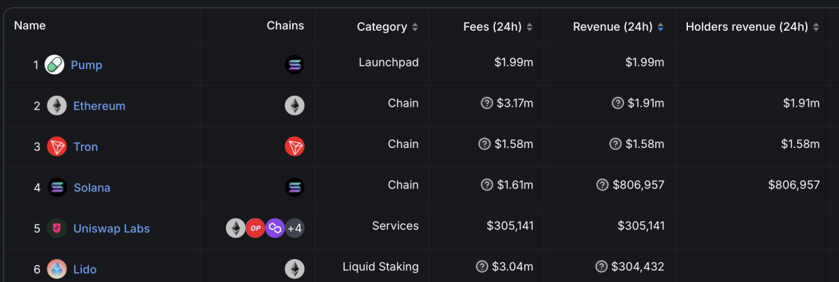 Pump.fun revenue over the past 24 hours has exceeded that of Ethereum. Image: DefiLlama.