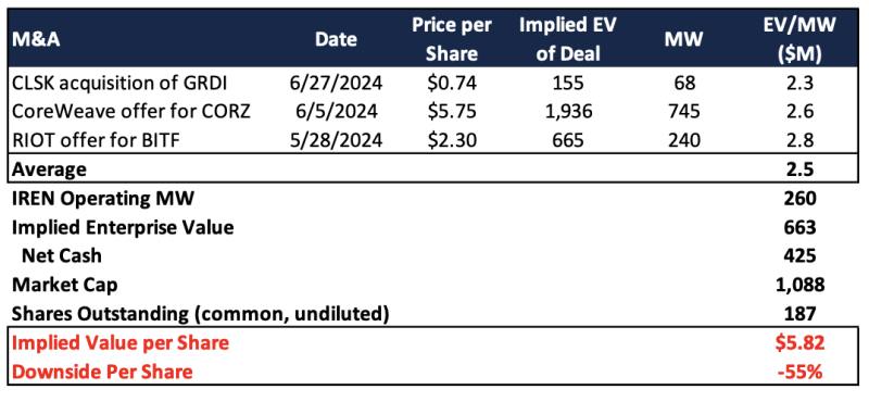“As shown below, each deal implied a valuation of $2.5 million per MW, on average. At the same multiple, IREN would trade to $5.75 per share, or 59% less than today’s price. Investors wishing for a buyout offer like those received by Core or Griid should be careful what they wish for.”