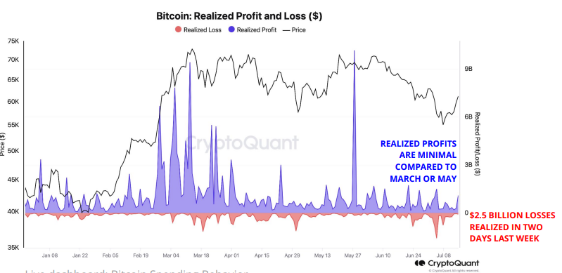 Thursday's CryptoQuant Weekly report noted that the recent drop in bitcoin's price to a low of around $55,000 last Wednesday resulted in the largest realized losses for the digital asset's holders so far in 2024. "Bitcoin holders realized losses of $2.5 billion in two days last week, while profit taking remained minimal compared to March. The realization of large losses is typically a sign of seller capitulation and it is associated with price bottoms," the CryptoQuant analysts said.