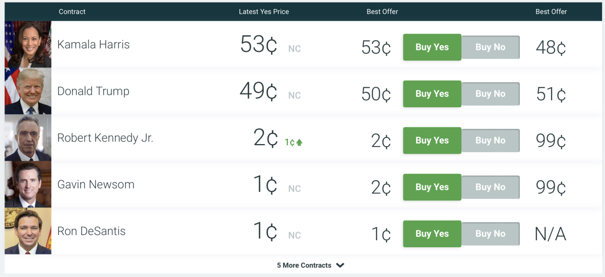 Online prediction market PredictIt favours Kamala Harris over Donald Trump. Image: PredictIt.