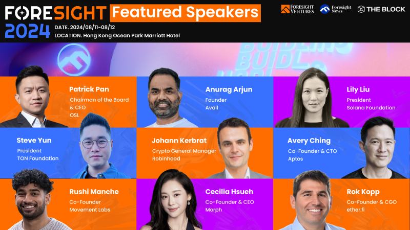 HONG KONG, August 6 - The third annual FORESIGHT Conference, a cornerstone event in the Web3 industry, is set to take place on August 11-12, 2024, at the Hong Kong Ocean Park Marriott Hotel. This global summit, jointly organized by Foresight News, Foresight Ventures, and The Block, aims to bridge Eastern and Western Web3 perspectives, bringing together the world's most innovative leaders to explore cutting-edge industry trends and shape the future of blockchain technology.