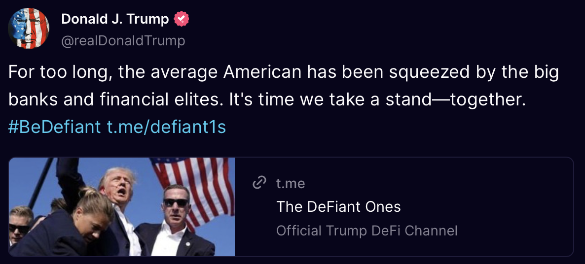 In a Truth Social post on Thursday, Donald Trump said that it was time to take a stand against big banks and financial elites and linked to the Telegram channel set up for the project.