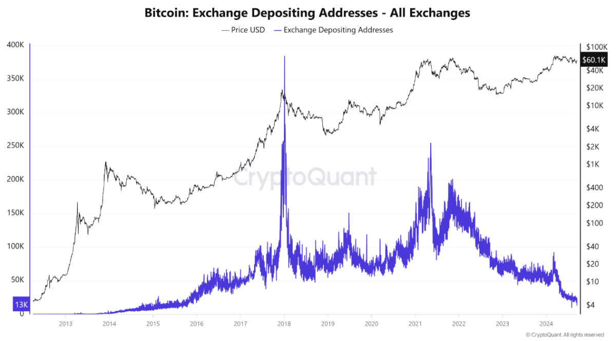 Bitcoin exchange depositing addresses at lowest level in years, indicating potential relief in selling pressure: CryptoQuant