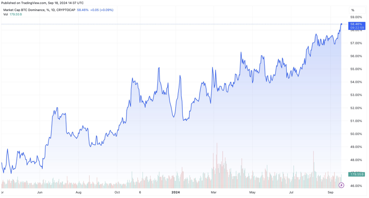 Bitcoin market cap dominance has reached a multi-year high. Image: TradingView.