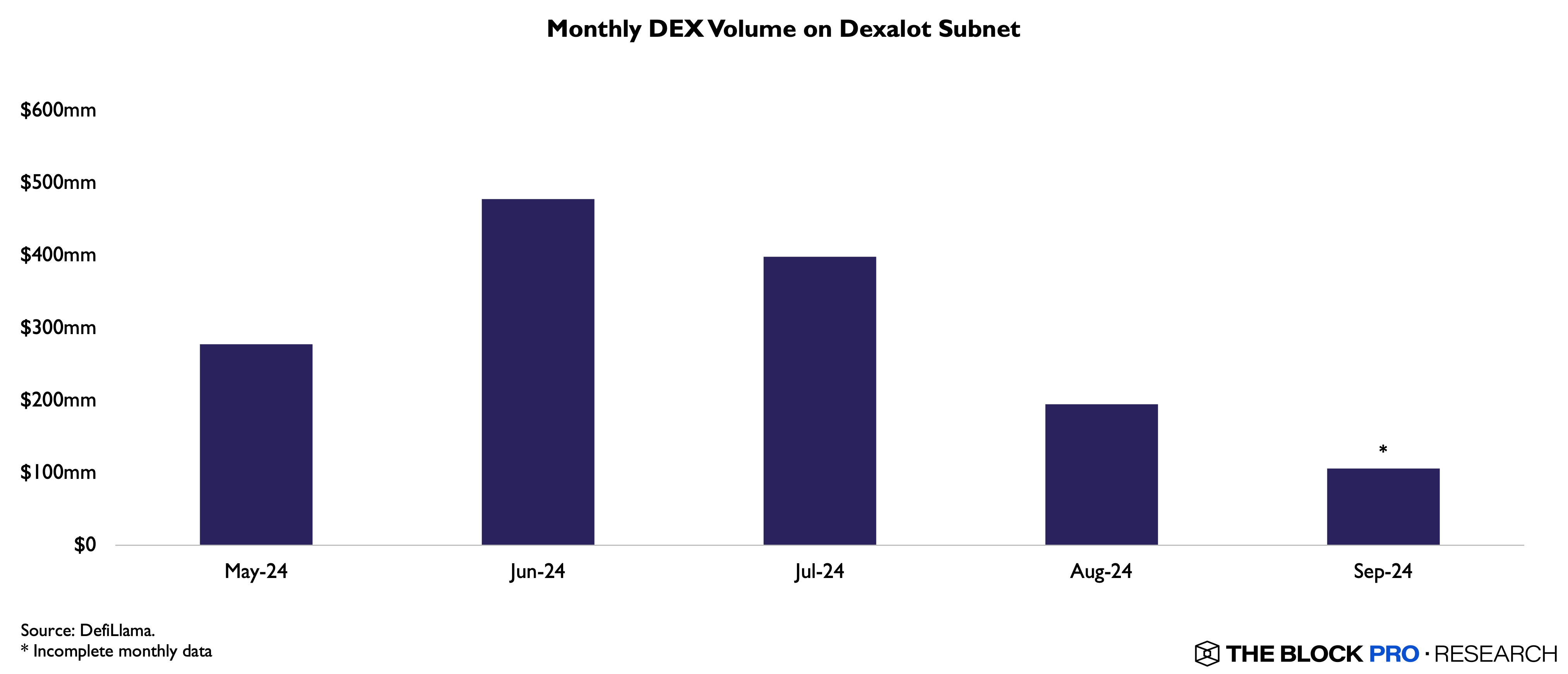 Monthly DEX volumes in the Avalanche ecosystem remain well below their March peak of ~$9.3 billion, but August’s total of ~$2.8 billion marks the highest monthly volume since the start of Q2 2024, which can likely be attributed to the BOOST program’s liquidity incentivization beginning in July, at least in part. One DEX that appears to have been negatively impacted by the increased trading volume on Avalanche C-Chain is Dexalot, which runs on its own Avalanche subnet.