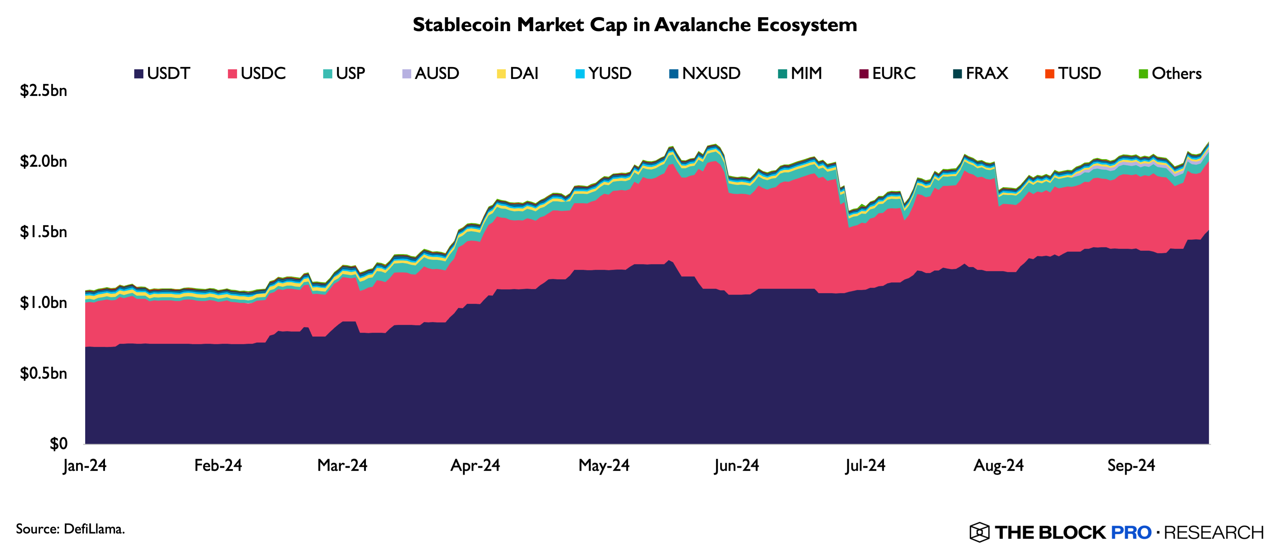 One final indicator worth examining is the supply of stablecoins in the Avalanche ecosystem. Since the beginning of July, Avalanche’s stablecoin market cap has grown from ~$1.69 billion to ~$2.14 billion as of this writing for a gain of ~27%, or ~$458 million.