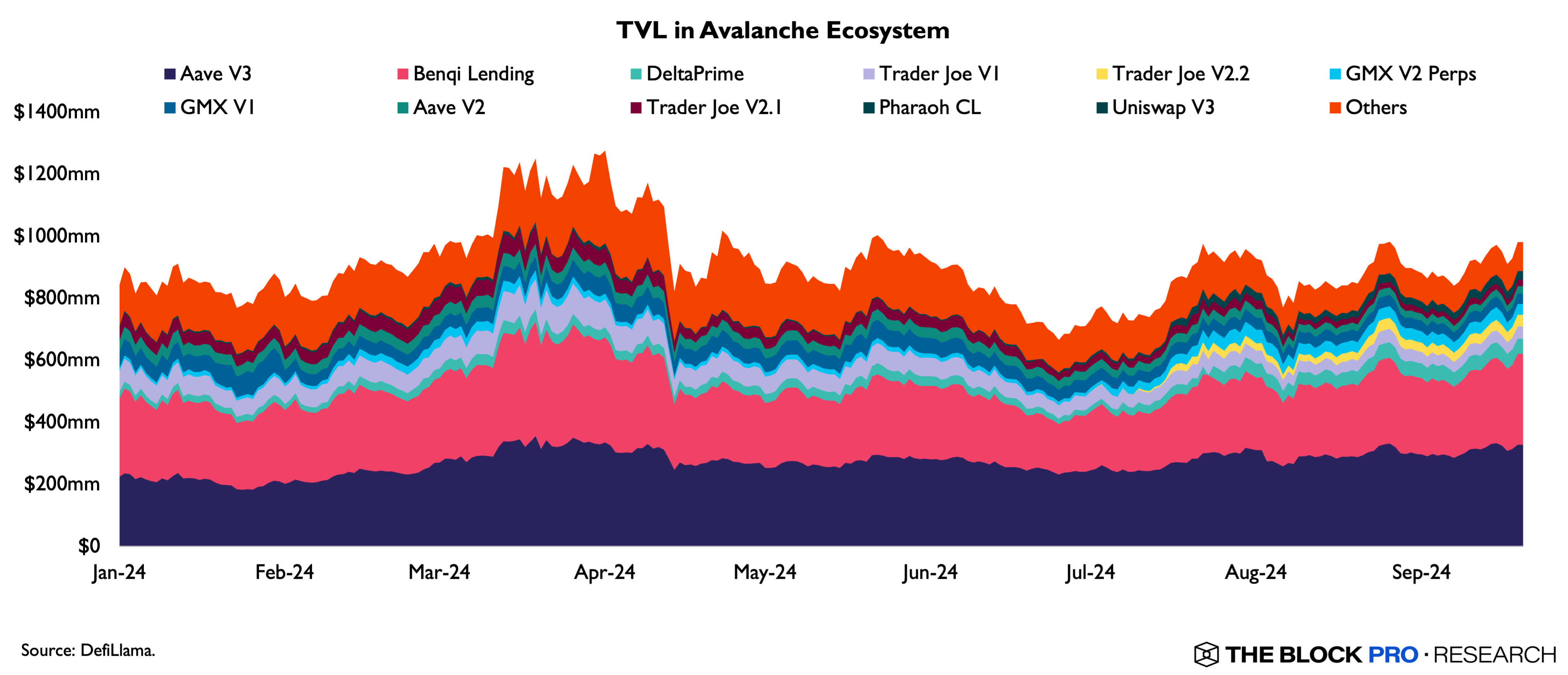 The BOOST campaign is reminiscent of the Avalanche Rush incentive program launched back in August 2021, which played a major role in pushing the Avalanche ecosystem’s TVL to its all-time high (ATH) of ~$11.4 billion in November 2021. Earlier this year, the Avalanche Foundation launched the Memecoin Rush incentive program that specifically targeted memecoin liquidity, whereas the BOOST program is catered more towards improving liquidity for well-established assets like BTC.b, USDC, USDT, etc. As of this writing, TVL on Avalanche sits at ~$980 million, up by ~$137 million since the start of 2024 and down slightly from its year-to-date (YTD) peak of ~$1.27 billion.
