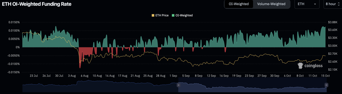 Ethereum futures funding rates have surged to positive highs not seen since just before the early August flash crash. Image: Coinglass