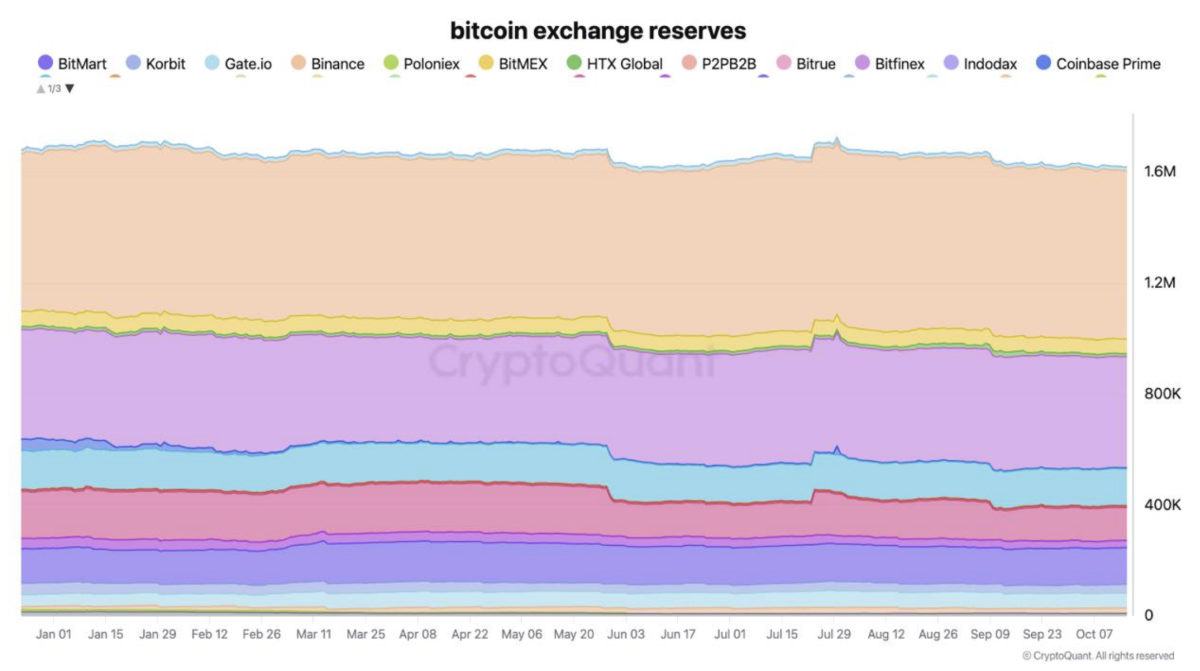 In October 2021, bitcoin exchange reserves hovered around the 3.2 million mark, indicating a decrease of approximately 590,000 coins since CryptoQuant started recording this metric.