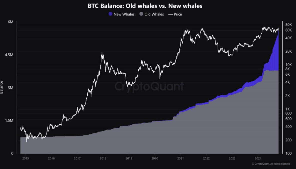 CryptoQuant defines new whales as wallets holding over 1,000 bitcoin, with an average coin age of under 155 days that are not centralised exchanges or miners.