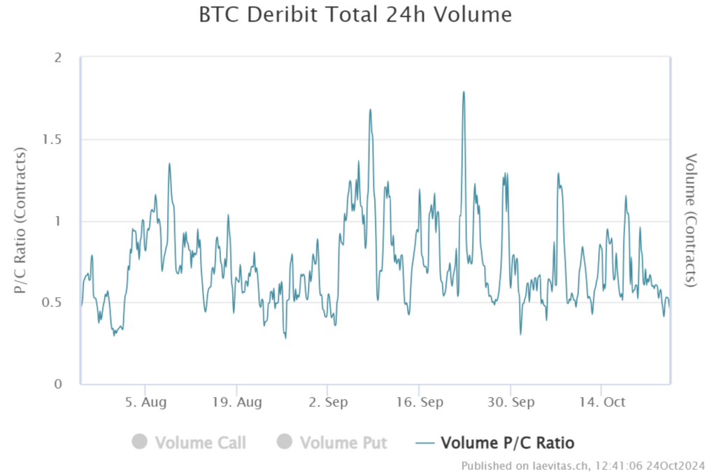 Lim highlighted that the put-call volume ratio for bitcoin options is falling. Image: Laevitas.ch