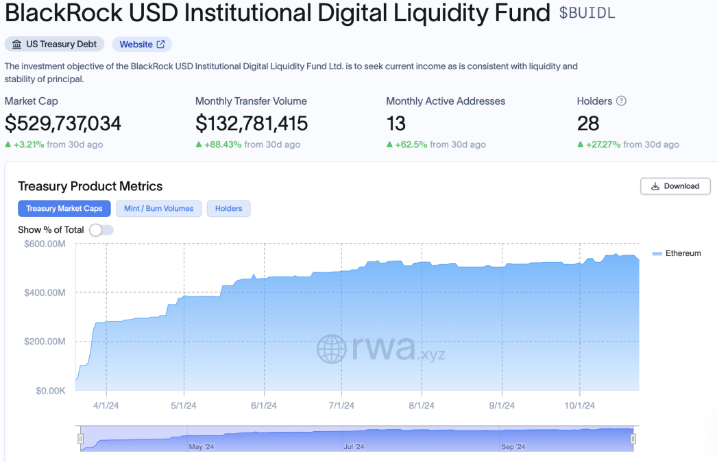 BlackRock's BUIDL fund has a market cap of over $500 million and 13 actve monthly addresses. Image: RWA.xyz