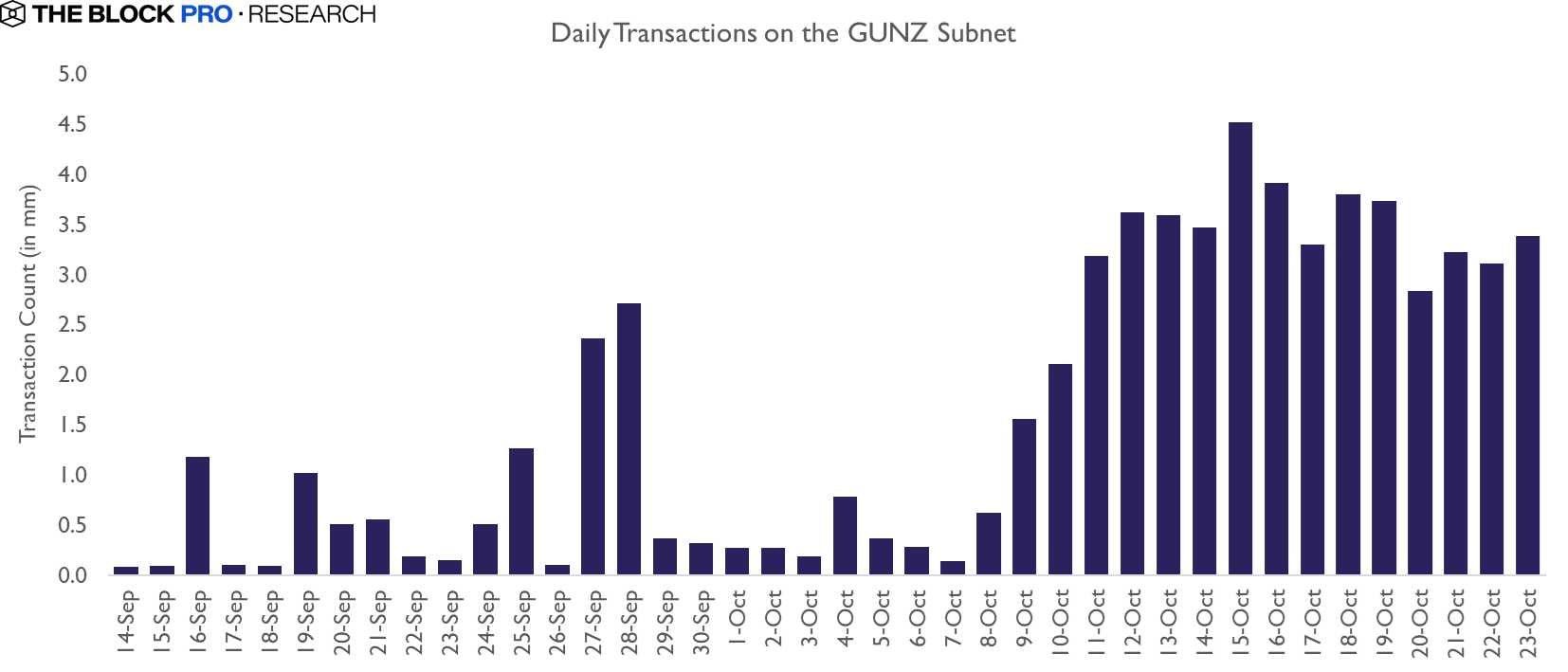 Over the next seven days, transaction volume grew by an additional 40% each day, eventually peaking at 4.5M transactions on October 15. Since then, the GUNZ L1 has consistently averaged more than 3.4M transactions per day.