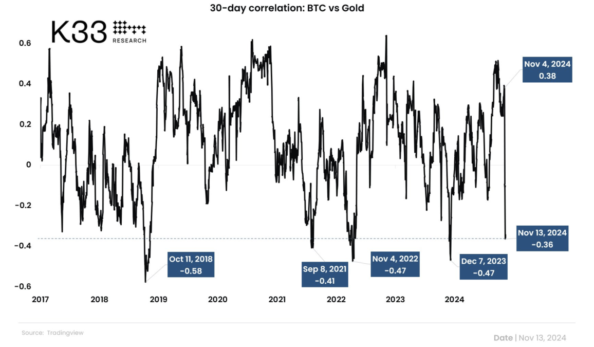 Meanwhile, K33 Head of Research Vetle Lunde noted that bitcoin’s correlation to gold has reached an 11-month low following the election, reinforcing the notion that the digital asset is carving out its own narrative amid economic uncertainty.