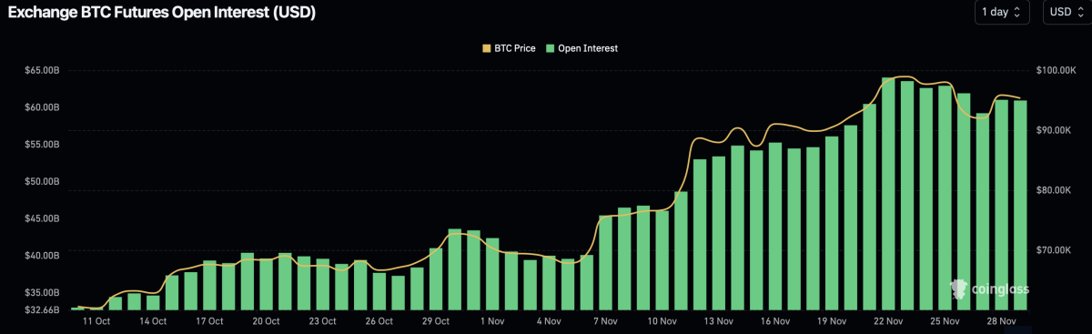 Bitcoin futures open interest jumped from $39 billion on Nov. 5 to currently stand at $60.9 billion, according to data from Coinglass. This represents a substantial increase in the value of positions tied to bitcoin derivatives contracts, many of which involve leverage.