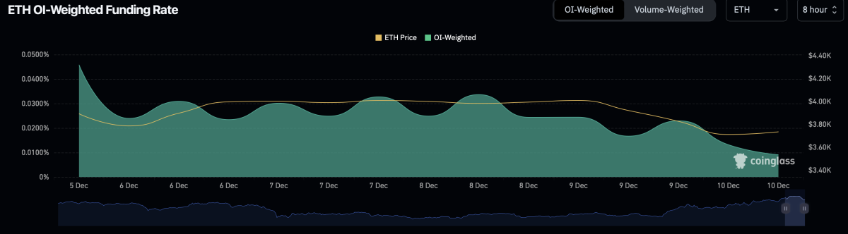Ethereum positive funding rates falls to a multi-week low. Image: Coinglass.